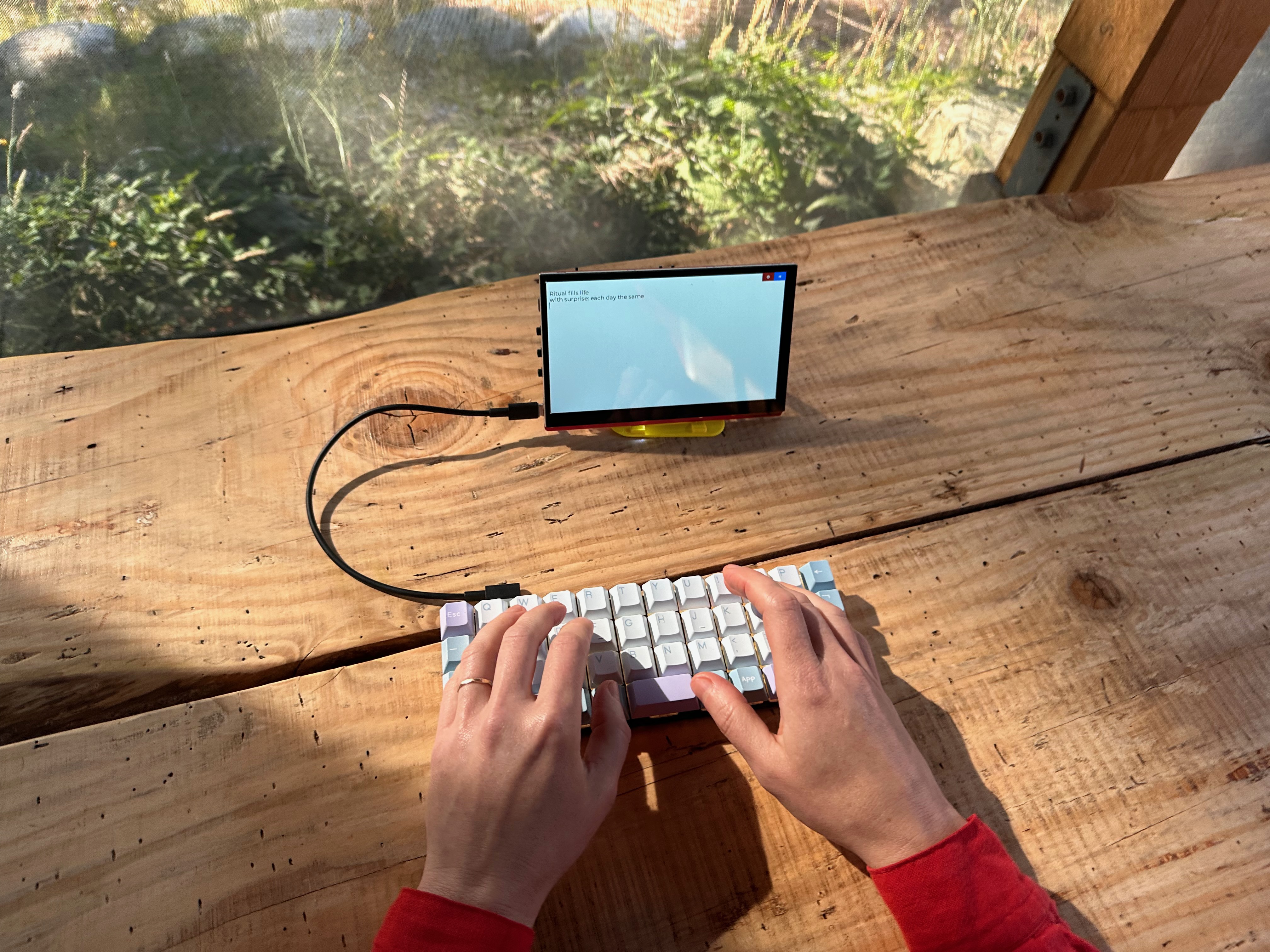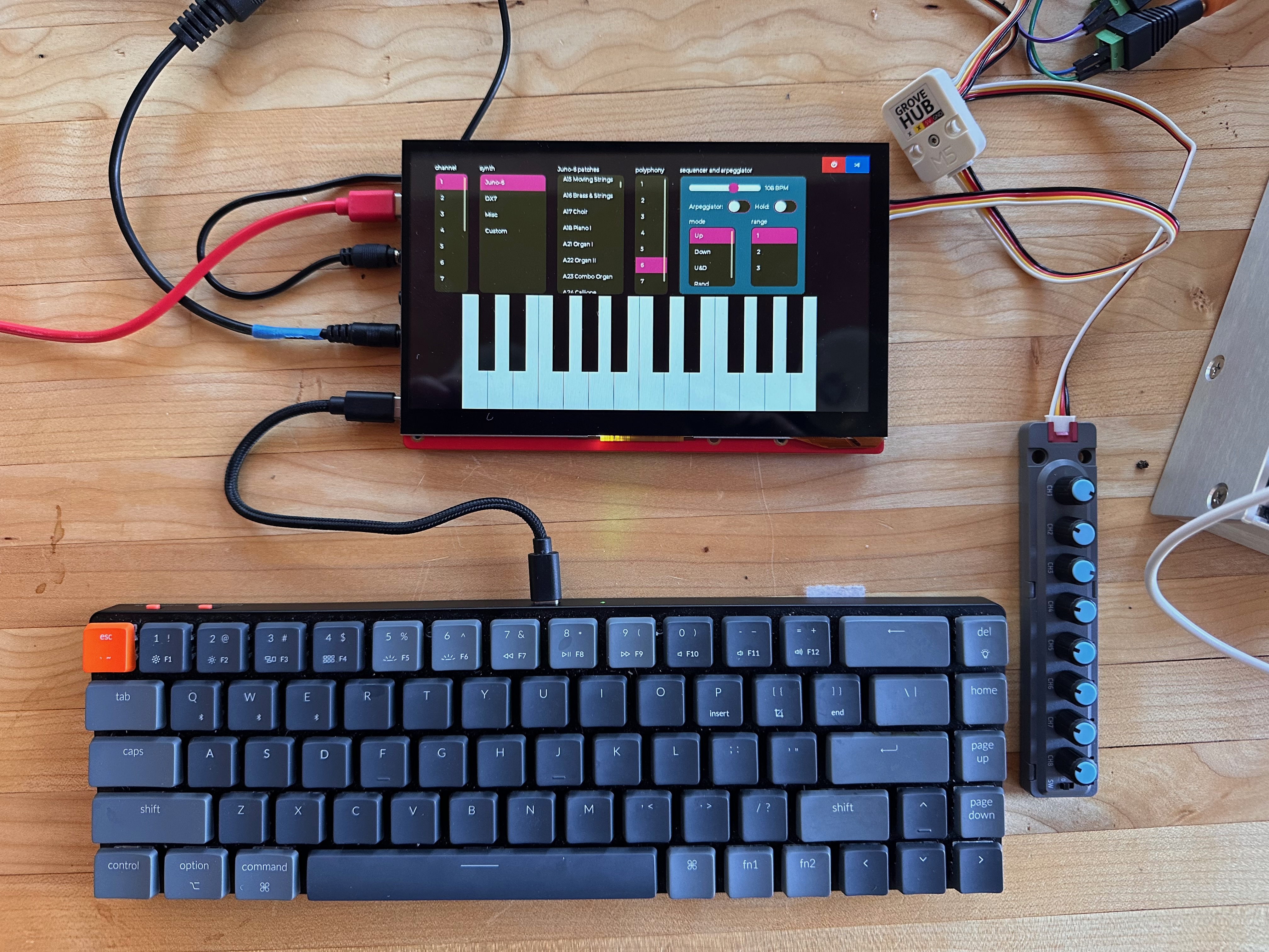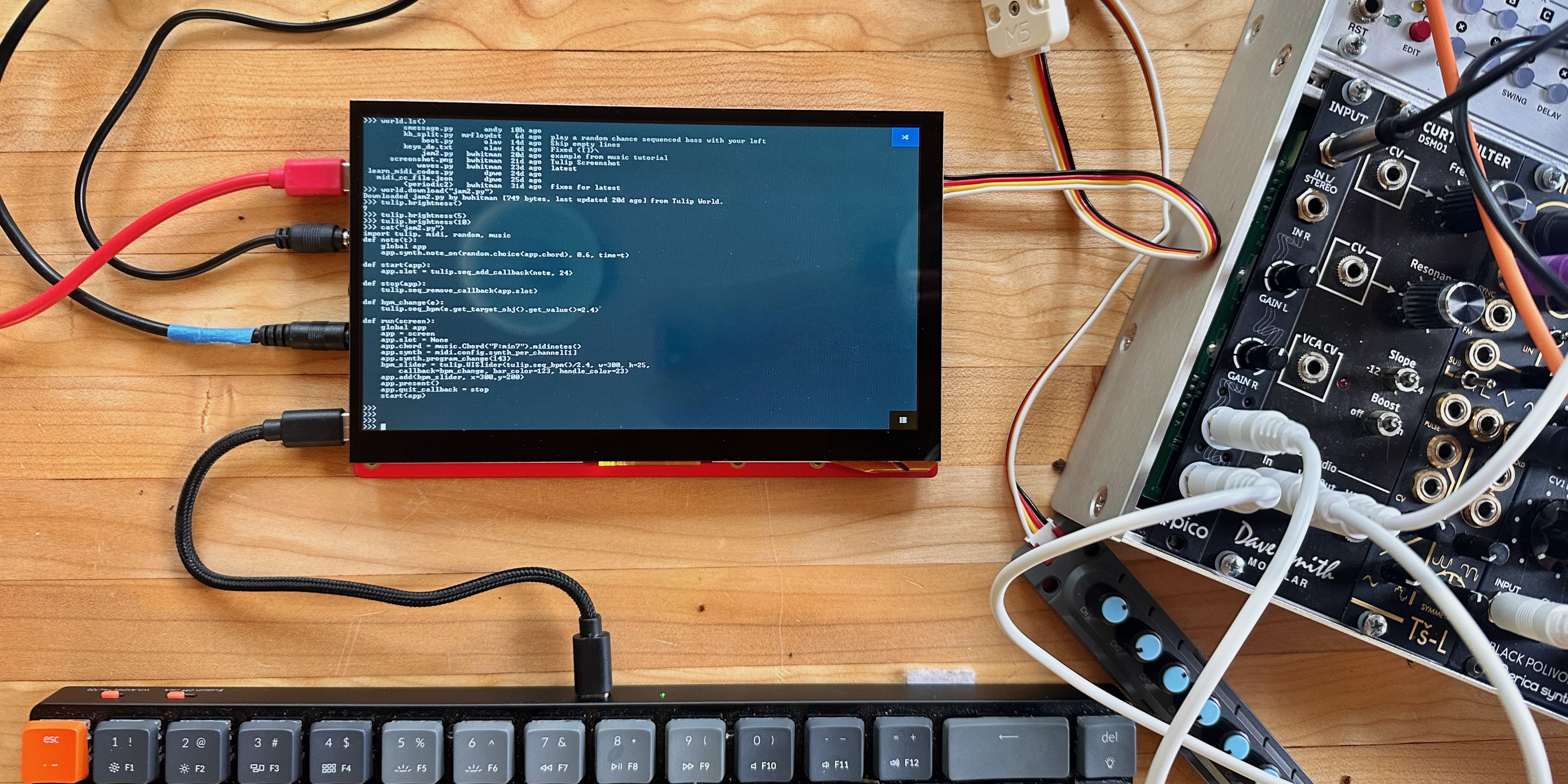 Tulip has stereo audio output, 3.5mm MIDI in and out jacks, a battery jack, USB for power, and another USB for any bring-your-own computer keyboard. You can also grab a I2C dongle for controlling modular synth CV jacks and some other fun accessories like external displays, knobs, and joysticks. Tulip can end up being a great non-laptop controller for your gear, or Tulip’s synth itself, all in Python code that you write.