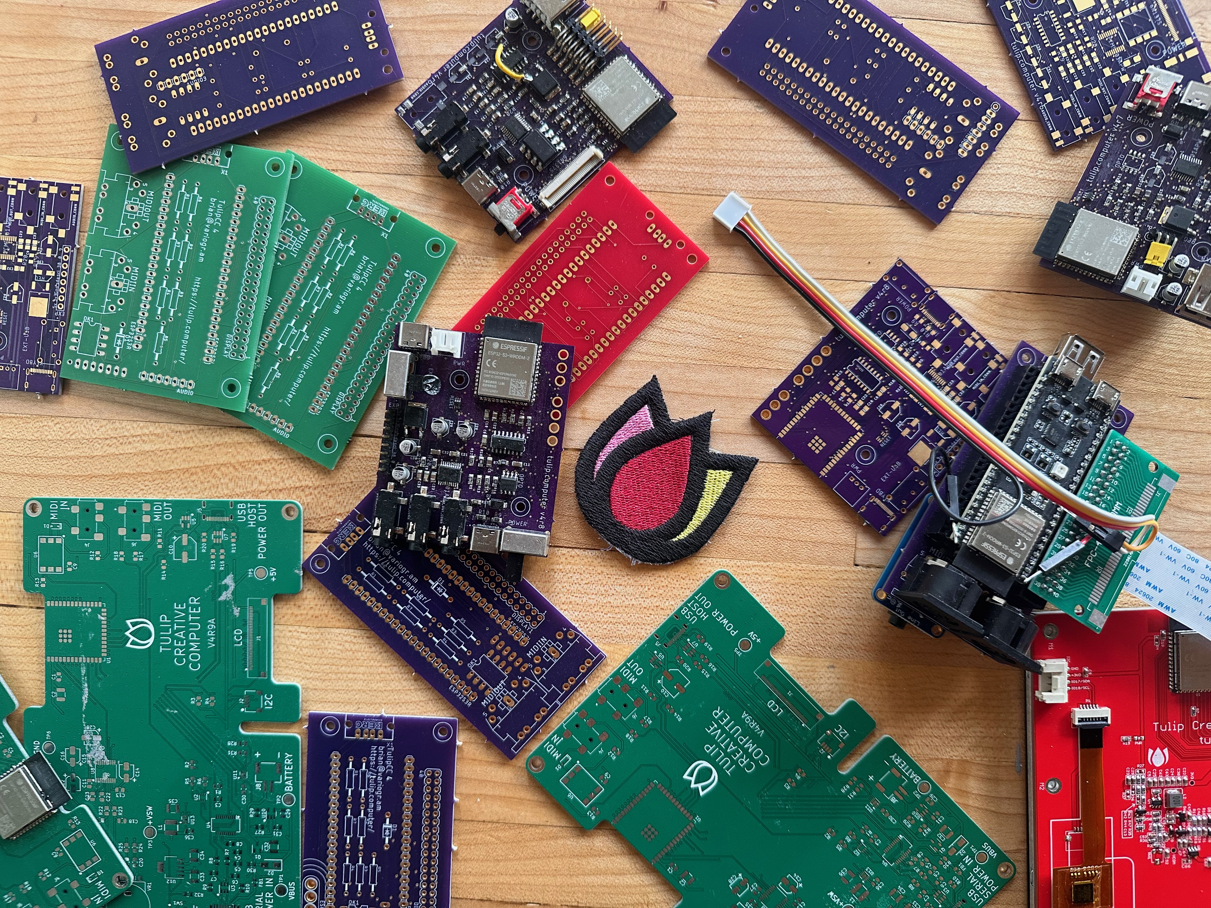 Tulip would not be possible without the constant help and support from the group chat / soldering tip line of Dan Ellis and Douglas Repetto, and tons of help and early PCB designs by Matt Mets and Nicolas Villar. Thanks especially to Charlin and Zeqing at Makerfabs for the design help. Thanks also to all my friends who have heard nothing but Tulip status updates from me over the years.